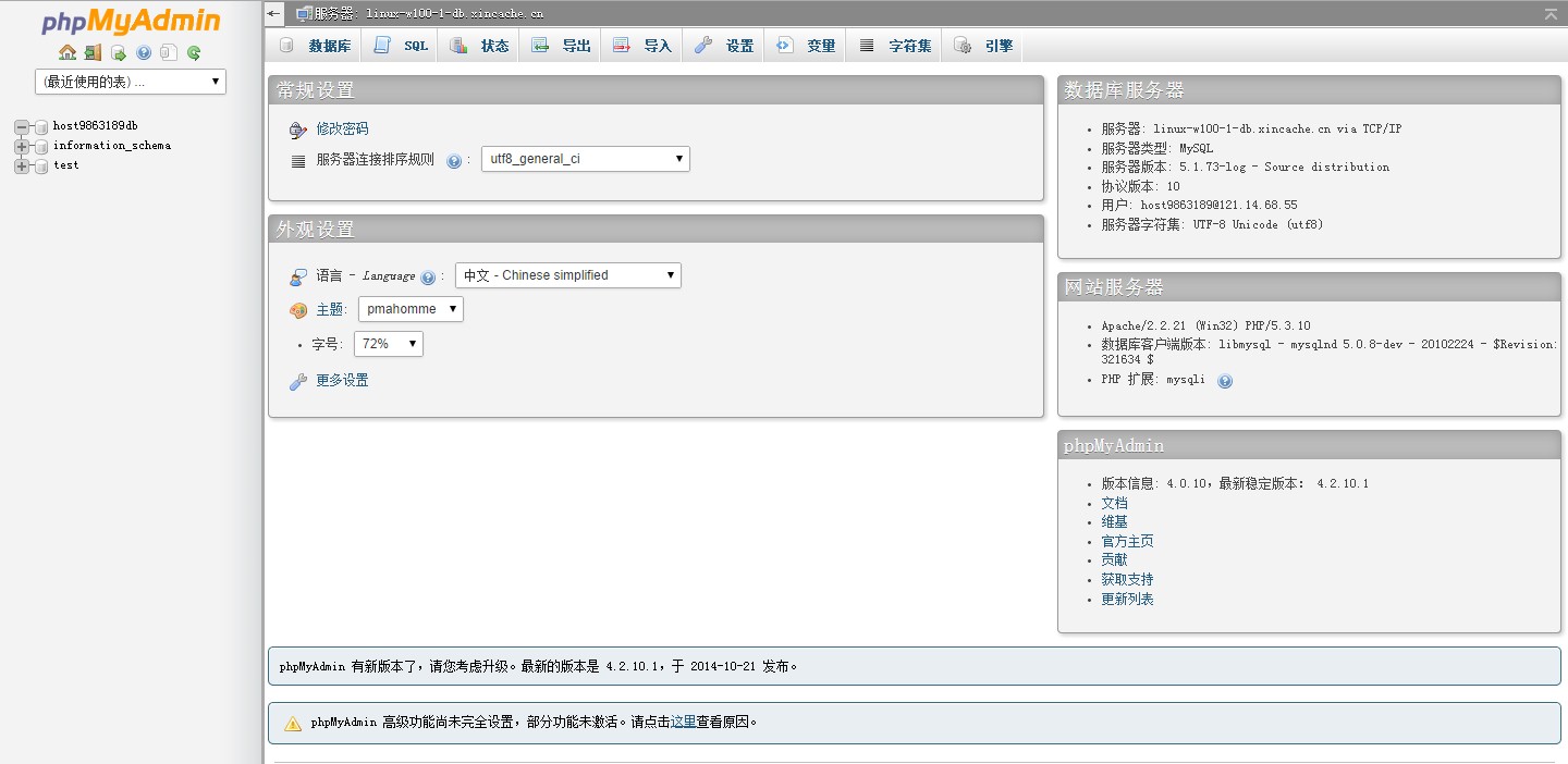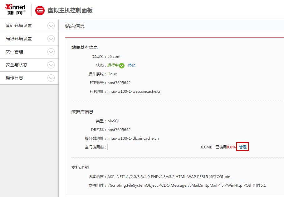 1、 當您進(jìn)入虛擬主機控制面板,點(diǎn)擊“管理”,可以登錄至phpMyAdmin的首頁(yè),在此頁(yè)面中您可以對您的數據庫進(jìn)行管理。
